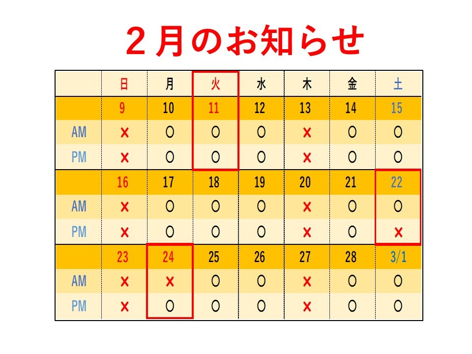 2/24(月)は午前休診、午後診のみ とさせていただきます。
